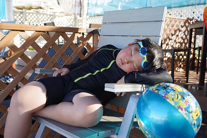 昼食を食べた後、子供達はプールをローテーションしながらガッツリ遊び、私はデッキチェアでウツラウツラしながら、時折子供達と合流して遊ぶの繰り返し。