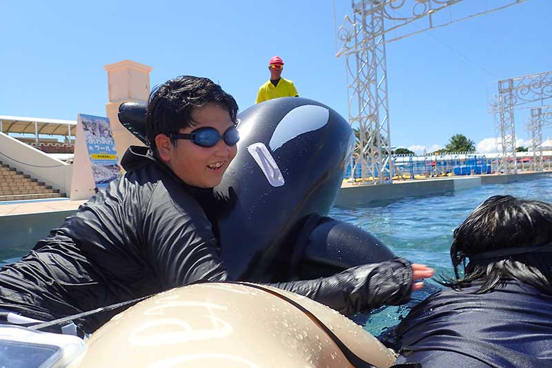 ※ちなみに、シャチの浮き輪には体重制限が有り、二人とも余裕でオーバーしていたようで、乗るのに苦戦した理由に納得。