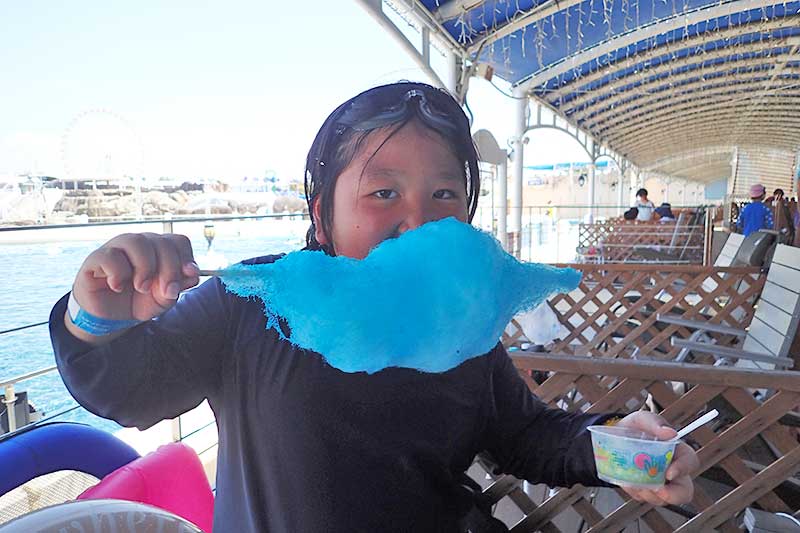 ※この写真、綿菓子だけかと思ったら、反対の手には-40℃のディッピンドッツアイスまで…。そりゃ~、この数年間でワガママボディに成長するハズです…(^_^;)
